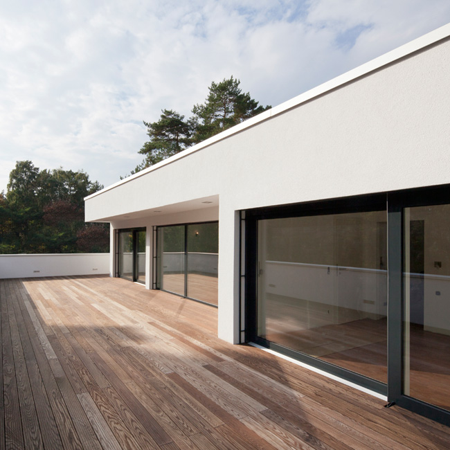 Klare Linien und ein modernes offenes Haus im Bauhaustil, wohnlich mit warmen, natürlichen Materialien ausgestattet.